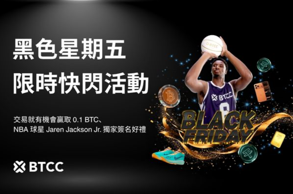 全球歷史最悠久的加密貨幣交易所 BTCC 宣布推出 2025 年黑色星期五活動「黑五限時快閃」,以高達 200 萬 USDT 總獎勵 引爆年末交易熱潮,更攜手全球品牌大使、NBA 明星 Jaren Jackson Jr.(JJJ) 推出獨家簽名收藏品,打造話題性十足的加密節慶。
