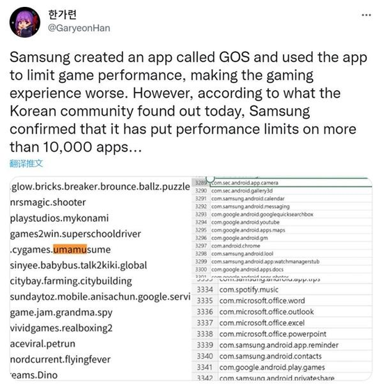 韓國推特用戶@GaryeonHan發文稱,三星Galaxy S22發明了一款名為GOS(全稱Game Optimizing Service」,遊戲優化服務)的應用程式。