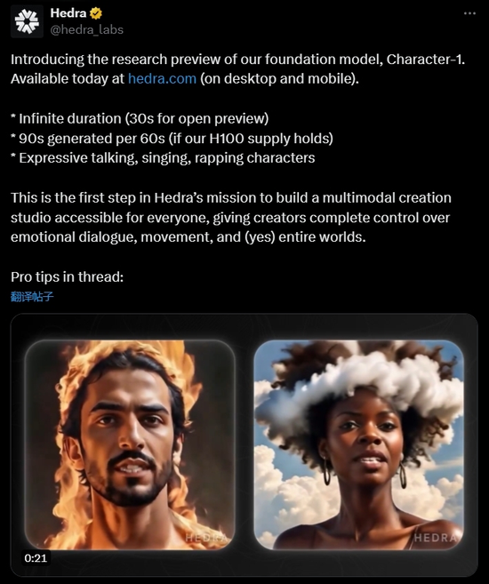 根據 Hedra Labs 官方消息,Hedra Labs 現已發表影片生成模型Character-1的研究預覽版,可供多平台用戶測試。