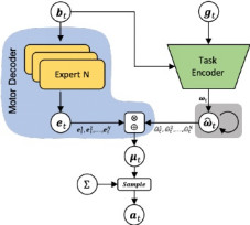 為了有效地將模仿策略轉換為競爭策略,FAIR使用了一個由任務編碼器(如下圖綠色)和運動解碼器(藍色)組成的新策略模型,該任務編碼器的輸出,以自回歸的方式更新(灰色)。