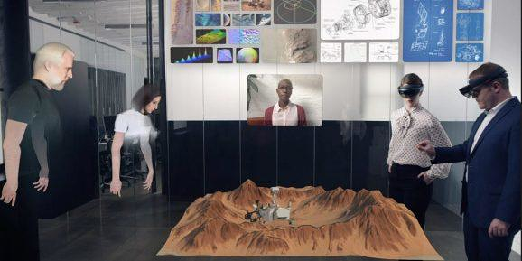 Spatial的虛擬實境解決方案,可以在用戶遠程開會時,將身邊的環境與其他會議參與者分享。帶有VR眼鏡的用戶掃視房間四周之後,其他同事就能看到對應的全像投影,並在物理隔絕的情況下,實現同場景交互。此外Spatial的AR解決方案,還可以為遠程會議中的每個人提供共享文檔、網頁、圖片等內容。