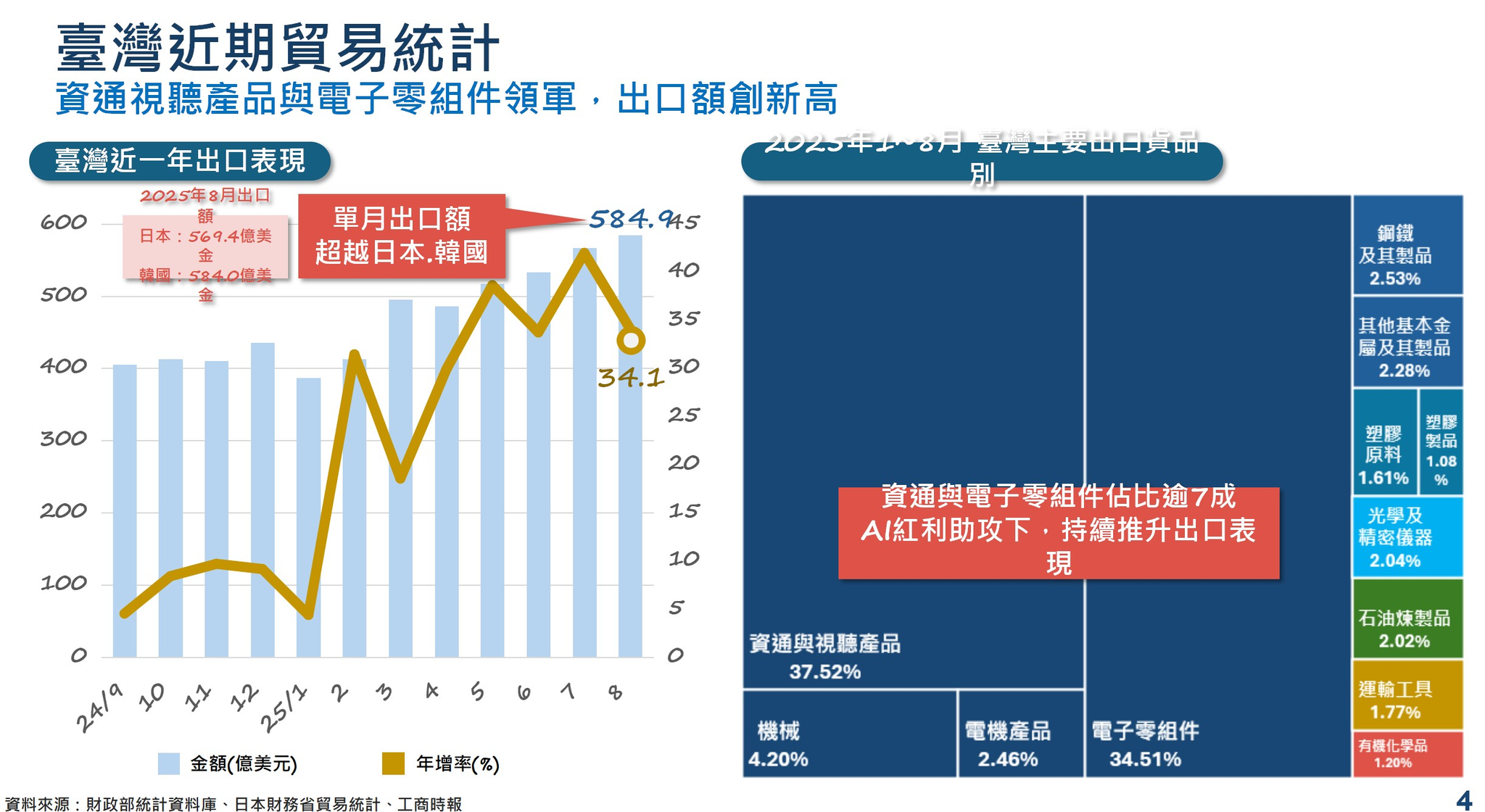 另外,根據今年八月份的資料,台灣出口金額超過日本及韓國。台灣人口僅有日本的六分之一,是韓國的一半,但外銷出口可以超越這兩國,這是很難得的成績。