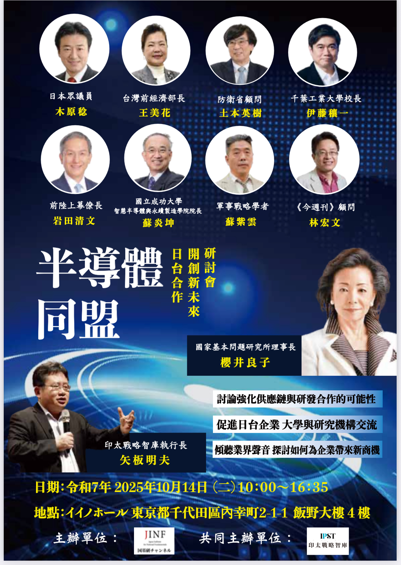 此次研討會由印太戰略智庫和日本智庫「國家基本問題研究所」共同舉辦,並由國基研理事長櫻井良子與印太戰略智庫執行長矢板明夫,分別與台日半導體產官學人士舉行座談。