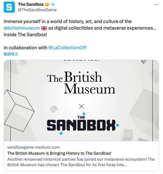 大英博物館(The British Museum)與去中心化元宇宙遊戲平台《The Sandbox》展開合作,並跟大英博物館的授權合作對象,法國新創公司LaCollection共同創建一系列NFT數位收藏品。