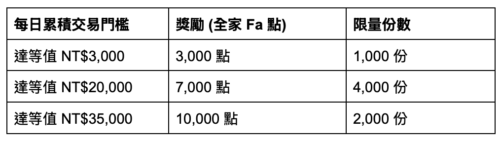 4. 鐵粉鉅獻 - 交易點數翻倍贈,再抽 iPhone 17 Pro Max: 活動期間,用戶每日累積交易量達指定門檻,即可獲得最高 10,000 點全家 Fa 點。此獎勵採每日結算、不累贈原則,以用戶當日達成的最高門檻為準,確保交易鐵粉天天有感回饋: