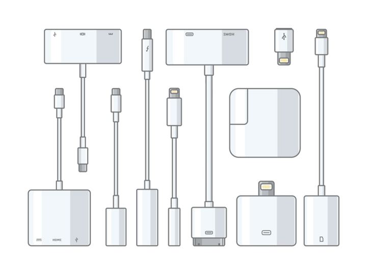 蘋果幾乎每一類產品都有不同的充電口,這些接頭不但繁多,而且幾乎都屬於蘋果專用,比如最初幾代iPhone使用的30針接頭,iPhone 從第5代換成了Lighting,這種不區分正反面且更為小巧的接頭,倒是備受好評,至今仍是蘋果行動設備中使用最多的接頭。